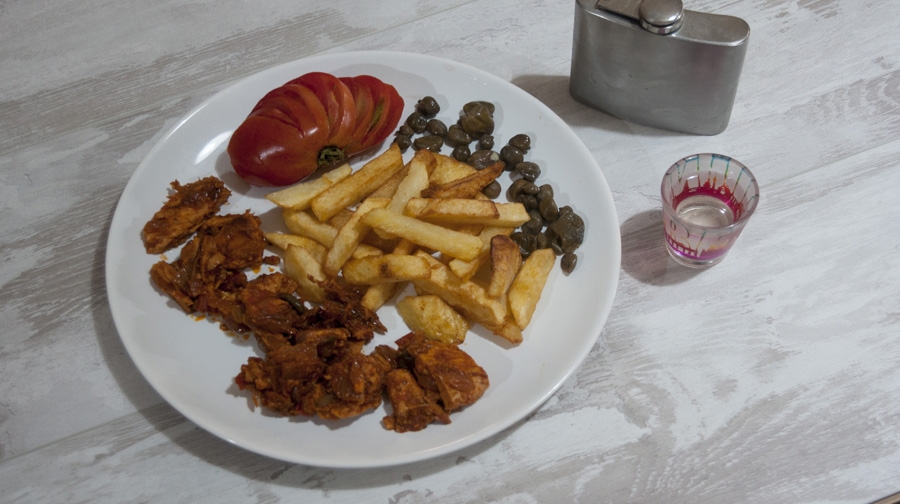 Σερβίρουμε με συνοδεία τηγανιτές πατάτες, φρέσκια ντομάτα και κάπαρη. Δροσιζόμαστε με σπιτικό τσίπουρο, παγωμένο από την κατάψυξη.